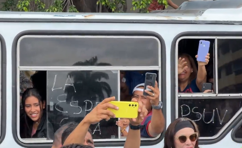 Autobuses con pintas del PSUV y “Nicolás es la esperanza” saludan y simpatizan con @MariaCorinaYA a su llegada en Valera, estado Trujillo.