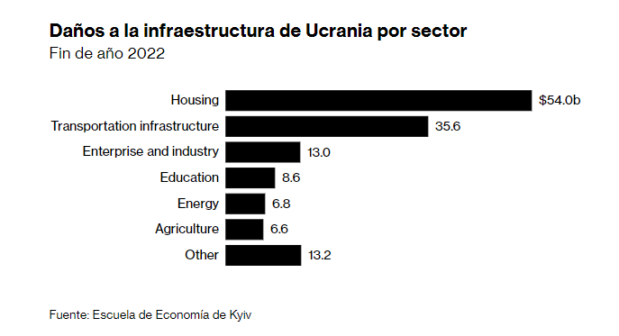 La KSE estima que la destrucción de solo los activos físicos de las empresas ucranianas asciende a 13.000 millones de dólares, mientras que los daños indirectos, como la pérdida de mercados o canales de distribución, superan los 33.000 millones de dólares. La agricultura fue más fuerte en las áreas del sur fértil que han sido escenario de intensos combates; la cosecha de trigo cayó de 32,5 millones de toneladas en 2021 a 26,6 millones de toneladas el año pasado, y una cuarta parte de eso fue para los ocupantes rusos.