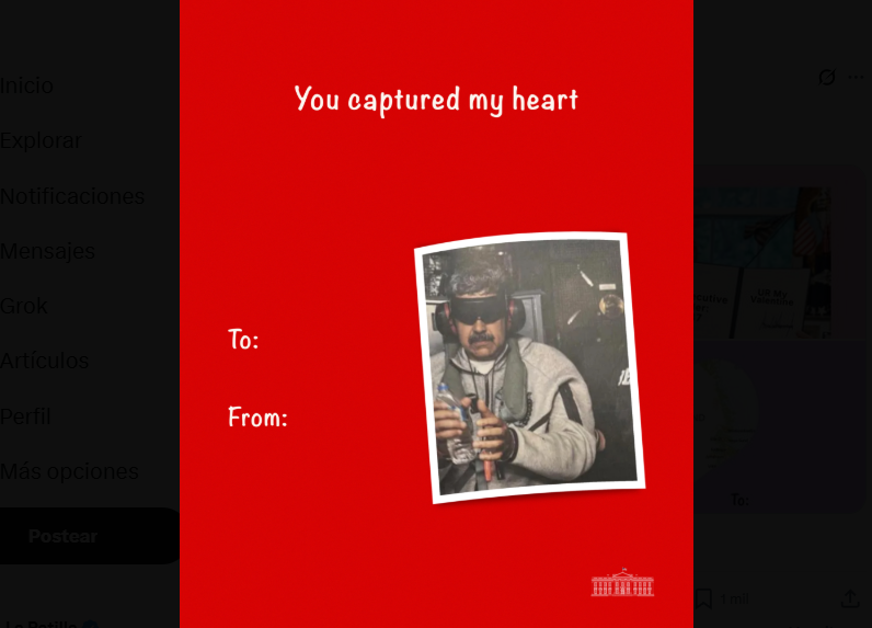 Entre las imágenes compartidas bajo el lema «Hecho solo para ti» (Made just for you), destaca una dedicada a Nicolás Maduro. La tarjeta muestra una fotografía de Maduro con los ojos vendados durante su reciente traslado a los Estados Unidos (tras su captura en enero de 2026 en la denominada Operación Absolute Resolve) y lleva el texto burlón:
