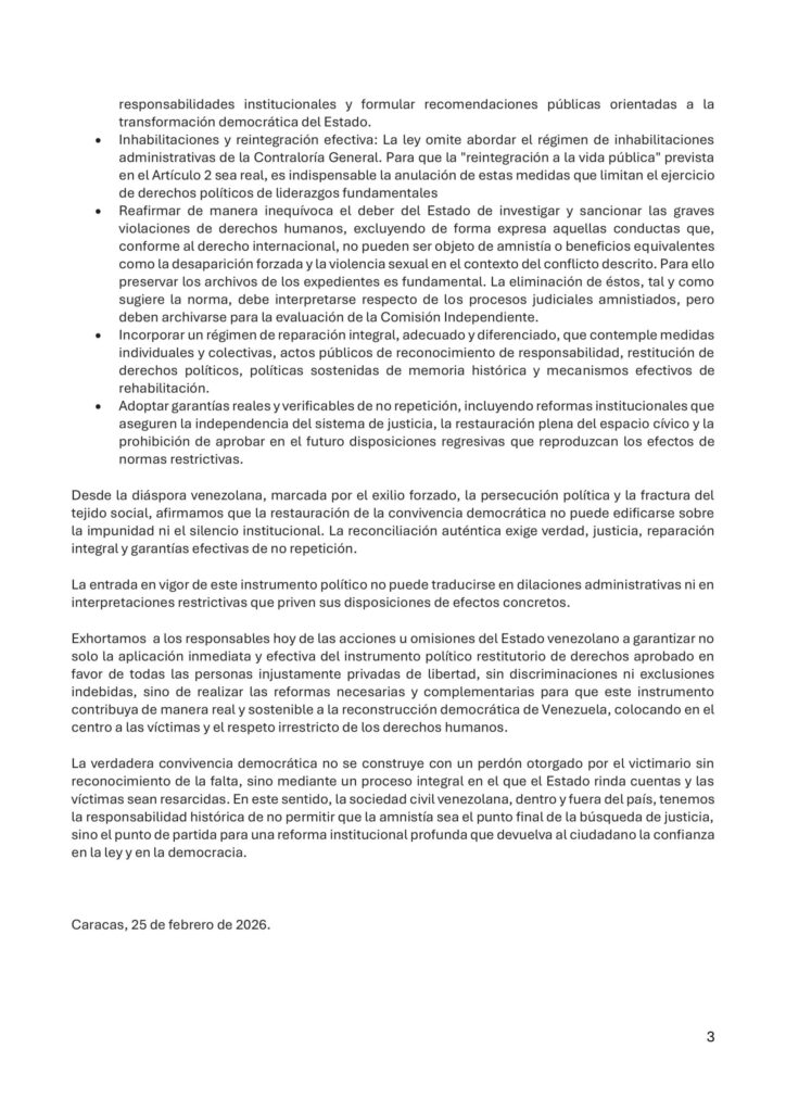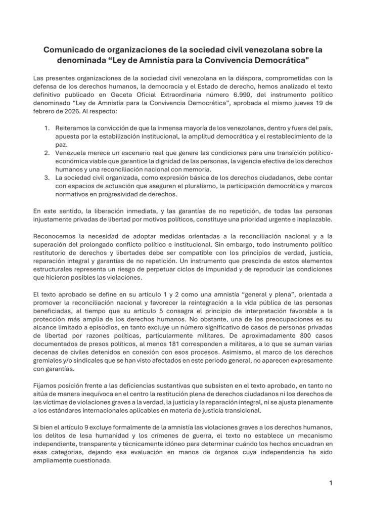 Las organizaciones señalaron que, pese a que la ley se define como una amnistía “general y plena”, su alcance está limitado a episodios específicos y deja por fuera a al menos 181 militares presos políticos, además de decenas de civiles vinculados a esos procesos.