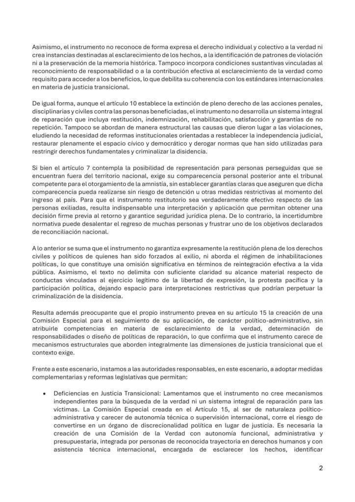 Las organizaciones instaron a las autoridades a adoptar reformas complementarias que incluyan la creación de una Comisión de la Verdad independiente; la anulación de inhabilitaciones políticas; un sistema integral de reparación para las víctimas; y reformas institucionales que garanticen la independencia judicial y el cese de la criminalización de la disidencia.