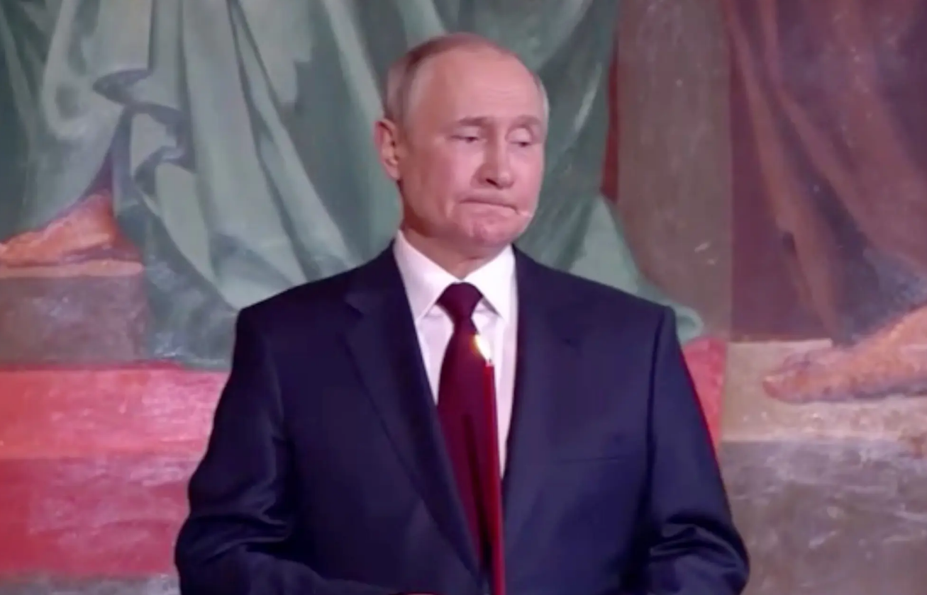 El belicista presidente se remueve incómodo, saca la lengua y se muerde los labios mientras el patriarca Kirill anuncia que “Cristo ha resucitado”, uniéndose a otros miembros de la congregación con la respuesta: “Verdaderamente ha resucitado”.
