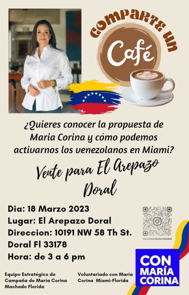 La coordinación del Voluntariado con María Corina Machado en la ciudad de Miami, invita a la comunidad a compartir un café en el icónico Arepazo de la calle 58 en Doral, para conocer al equipo del Comando Estratégico de campaña de María Corina Machado en Miami, camino a las elecciones primarias de la oposición.