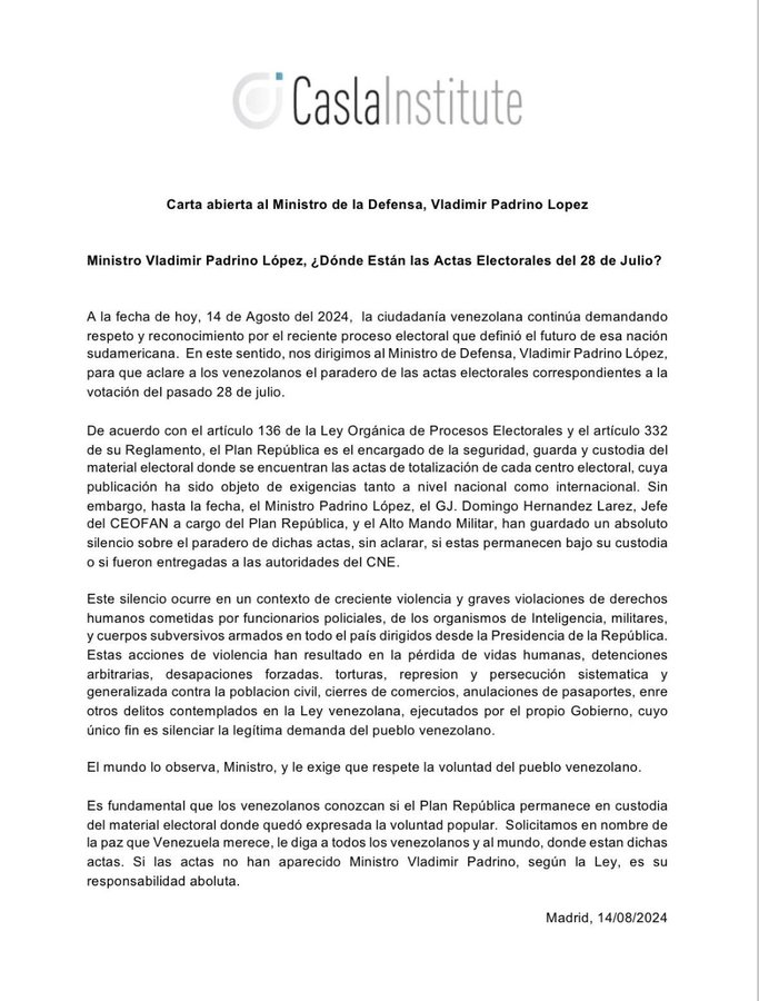 “El Alto Comisionado de las Naciones Unidas para los Derechos Humanos, Volker Türk, expresó el martes su profunda preocupación por el elevado y continuo número de detenciones arbitrarias, así como por el uso desproporcionado de la fuerza que se ha registrado tras las elecciones presidenciales en Venezuela, y el clima de miedo resultante”, describe el texto del organismo.