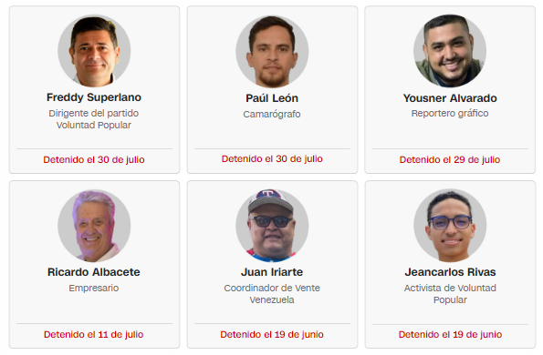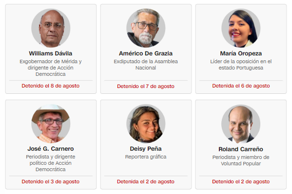 Entre las detenciones de alto perfil se encuentran la del exgobernador del estado Mérida y dirigente de Acción Democrática (AD), Williams Dávila Barrios; el exdiputado opositor Américo De Grazia; y María Oropeza, coordinadora del Comando con Venezuela en Portuguesa, quien transmitió en vivo el momento en que las fuerzas de seguridad irrumpieron en su domicilio. Días antes, según un video difundido por su partido en redes sociales, varias personas vestidas de negro se llevaron por la fuerza al dirigente de Voluntad Popular Freddy Superlano.