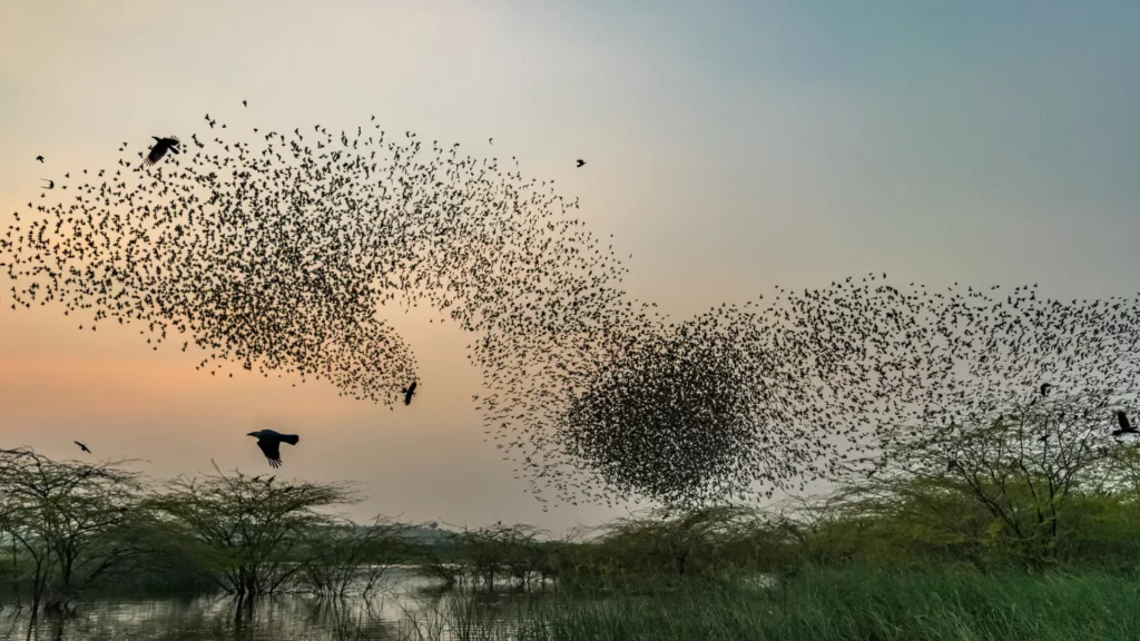 Los murmullos de los pájaros también andan de puntillas entre el orden y el desorden. Pueden dispersarse en cualquier segundo para confundir a un depredador.