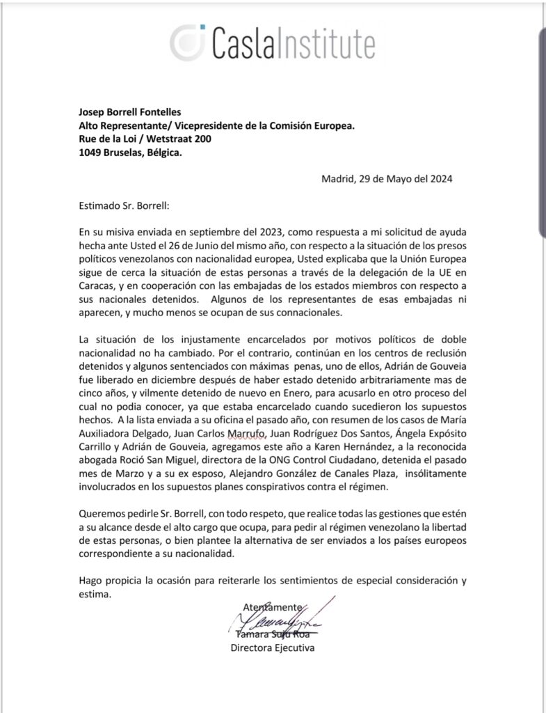 El Instituto CASLA envía Carta al Alto Representante / Vicepresidente de la Comisión Europea pidiéndole realizar las gestiones que sean necesarias para que los presos políticos de doble nacionalidad venezolana y europea sean liberados o enviados a los países de su otra nacionalidad. La Lista crece Sr. BORRELL!