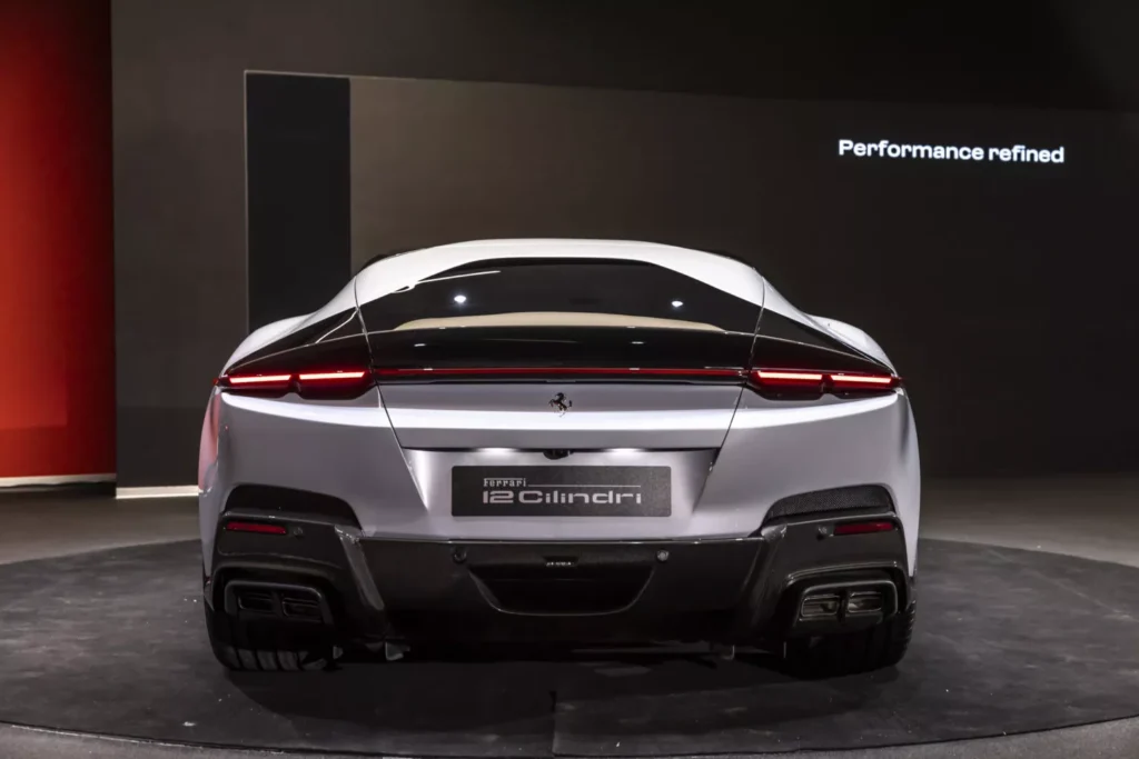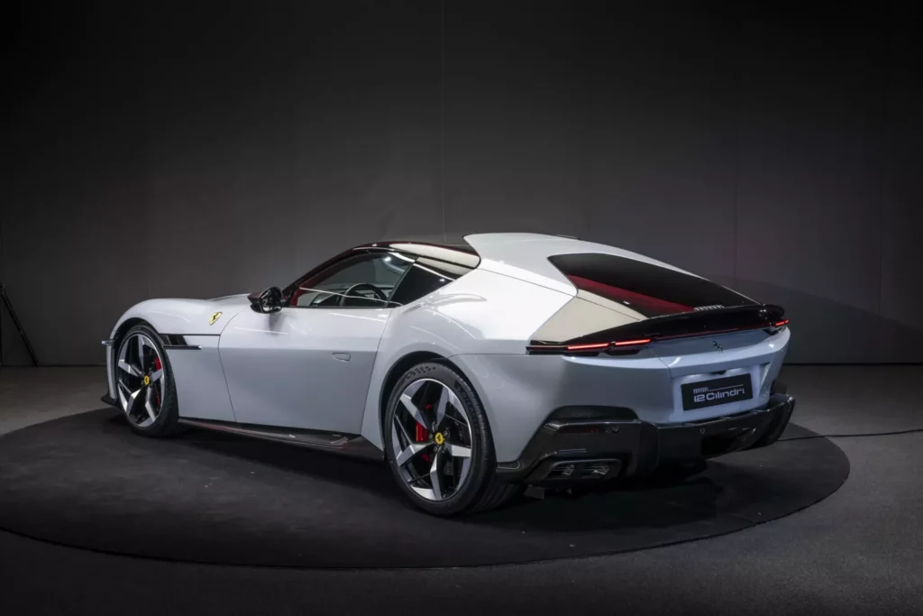El 12Cilindri tiene un aspecto bastante diferente al de otros modelos actuales de Ferrari. Desde el frente, nos recuerda al icónico 365 GTB/4 Daytona con faros nítidos, DRL y un elemento negro brillante entre las luces. Ferrari dice que el nuevo automóvil tiene un lenguaje de diseño más «sofisticado» que el 812Superfast , centrándose en líneas limpias y proporciones musculosas. También hay muchos trucos aerodinámicos.