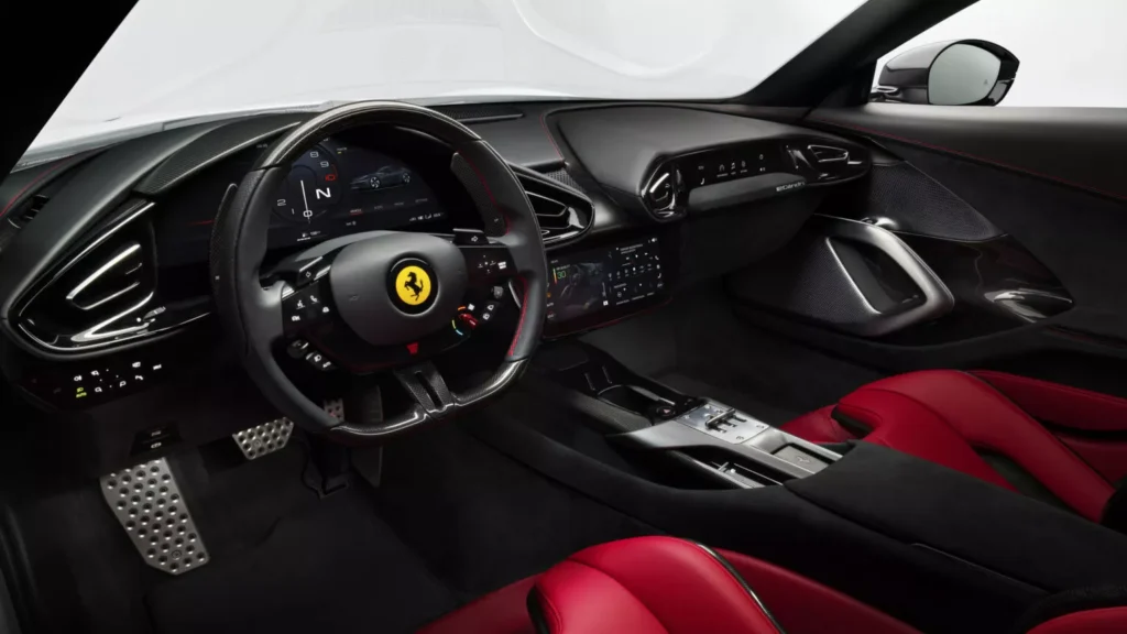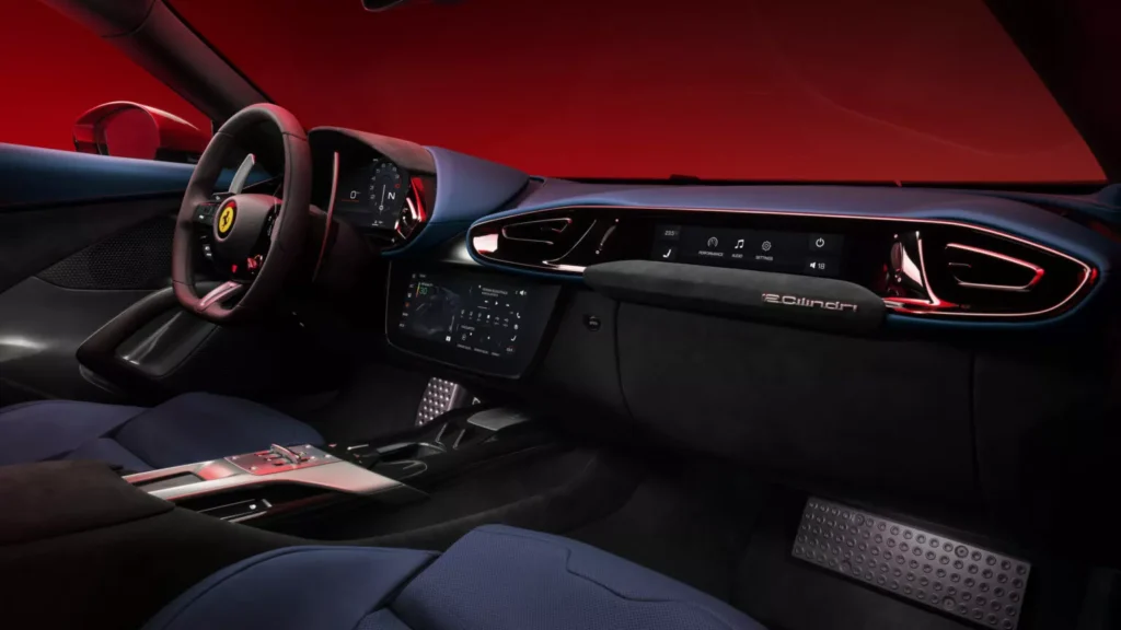 Al igual que otros modelos de Ferrari, el interior del 12Cilindri está dominado por grandes pantallas. En el centro del tablero se encuentra una pantalla de información y entretenimiento de 10,25 pulgadas, mientras que detrás del volante hay una enorme pantalla para el conductor de 15,6 pulgadas. También se ha instalado una pantalla de 8,8 pulgadas para disfrute del pasajero. Ferrari también ha conservado los mismos controvertidos botones capacitivos del volante que el 296, pero estos botones ahora tienen muescas. Los compradores que prefieran escuchar música que disfrutar de la sinfonía V12 pueden optar por su automóvil con un sistema de audio Burmester de 15 parlantes.