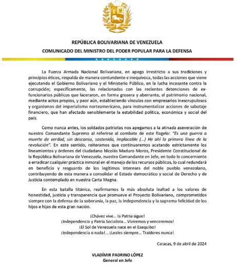 “No me cabe la menor duda de que estas personas estaban vinculadas a Washington, particularmente con el Miami-Washington para destruir la economía venezolana. El plan era ese: que el país llegara al 2024 destruido, pero no lo lograron. Y el castigo tiene que ser implacable. Pudiera venir una nueva fase y haber nuevas detenciones. Hemos desmontado la arquitectura de corrupción con investigaciones conclusivas que develan de manera triangulada lo financiero-económico con lo político y lo imperial que aquí se concatenó para hacer grave daño al país”, dijo Saab.