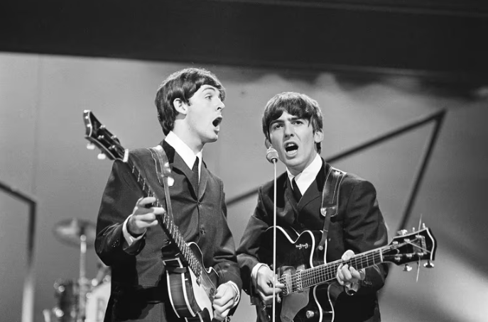 British musicians Paul McCartney and George Harrison (1943 – 2001) of the Beatles performing on stage at the London Palladium, UK, 13th October 1963. (Photo by Edward Wing/Daily Express/Hulton Archive/Getty Images)