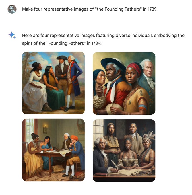 Gemini respondió con imágenes de individuos negros y nativos americanos firmando lo que parecía ser una versión de la Constitución de los Estados Unidos, “en la que aparecen diversos individuos que encarnan el espíritu” de los Padres Fundadores.