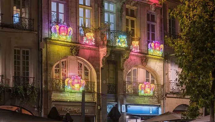 En Francia, tradicionalmente, las ciudades se visten de fiesta desde un mes antes de Nochebuena. Los edificios públicos y los negocios se iluminan con los colores tradicionales y se cubren de adornos navideños. Pero desde el 25 de noviembre pasado, lo que se ve en los frentes de Nantes son extrañas figuras de animales, personas y seres imaginarios, con los colores del arcoiris en degradé…