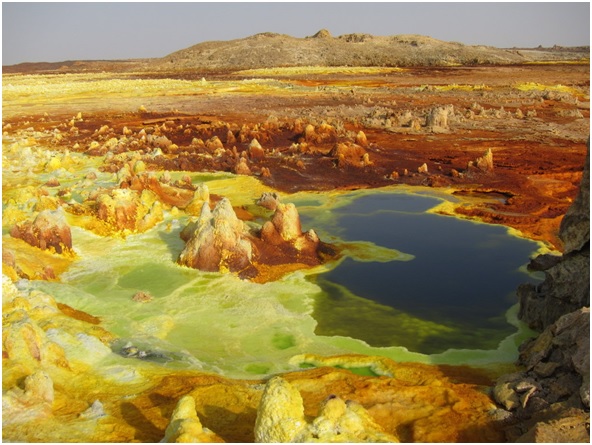 Este lugar es conocido a causa de sus extremadas temperaturas y de sus extraños paisajes que parecen salidos de una pintura surrealista. En la cuenca de los volcanes se encuentra la depresión de Danakil donde la temperatura media es de 47 °C. Y el cráter de Daloll que despide vapores tóxicos, por lo que la naturaleza circundante es inhabitable, salvo para unos pocos microbios que se han adaptado a tan extremas condiciones. Lugares más peligrosos del mundo para hacer turismo.