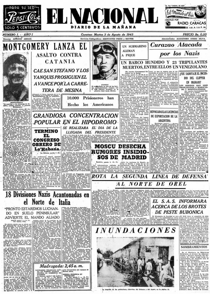 Aquella portada, hoy día icónica, tenía como informaciones principales dos noticias sobre la Segunda Guerra Mundial, una era el avance de los Aliados en Sicilia y otra el hundimiento del buque holandés Rosalía, atacado en el Caribe por los nazis, quienes emprendieron una operación para impedir que el petróleo venezolano siguiera llegando a sus enemigos.