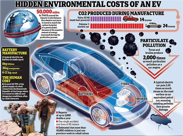 Y luego está el tema de la minería de metales raros. Una batería típica requiere 8 kg de litio, 35 kg de manganeso y 6-12 kg de cobalto, todos los cuales deben extraerse.
