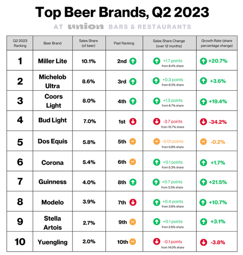 «Nuestros datos de pedidos en las instalaciones muestran que las marcas de cerveza nacionales están obteniendo los mayores beneficios de las consecuencias de Bud Light», dijo Layne Cox, director de marketing de Union.