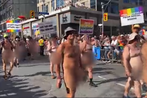 Bud Light se desempeña como patrocinador oficial del desfile del Orgullo de Toronto, donde las imágenes de video muestran a hombres desnudos de pie y andando en bicicleta a la vista de los niños que asisten al evento.