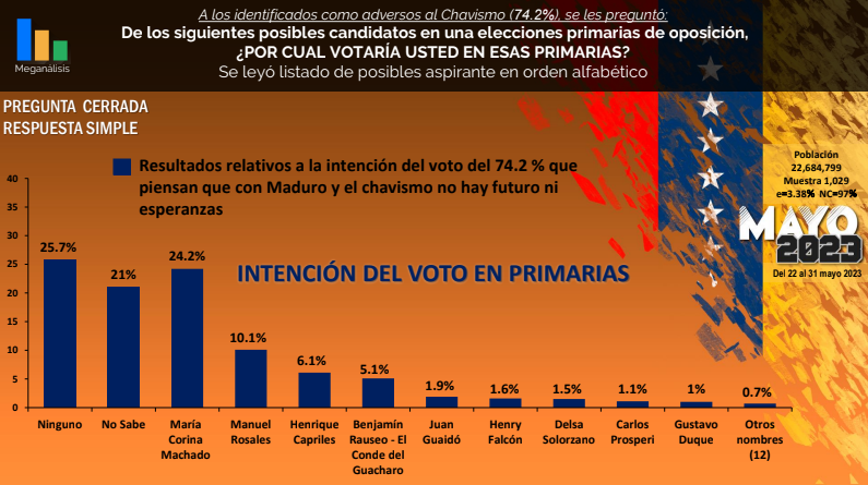 De aquellos opositores con intención de voto (74.2 %), el 24.2 por ciento lo hará por María Corina Machado frente a un 10.1 % para Manuel Rosales que se ubica en el segundo lugar.