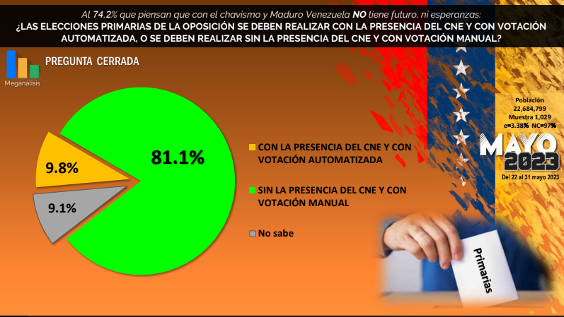 Consultados sobre la participación del Consejo Nacional Electoral en la Primaria del próximo mes de octubre, el rechazo del ente comicial se ubica en un 81.1 %. Los ciudadanos prefieren la votación manual sin la presencia del «poder» electoral.
