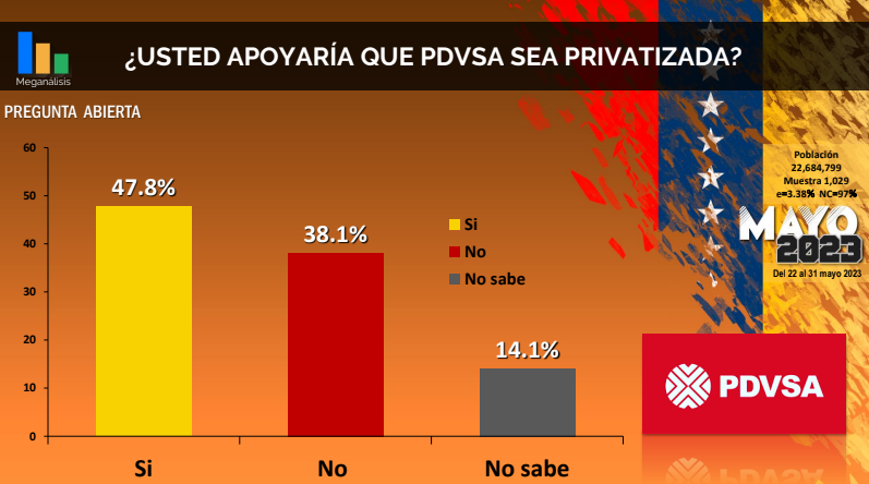 Para el mes de mayo, el 47.8 por ciento de los venezolanos apoyarían una futura privatización de Petróleos de Venezuela. En el estudio, se revela también que surtir gasolina ha sido dificultoso en los últimos 10 días del levantamiento de la muestra. Los encuestados consideran muy malo el servicio de transporte público del país.