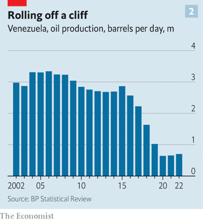 La economía de Venezuela es apenas una cuarta parte del tamaño que tenía antes de que Maduro asumiera el cargo en 2013. Recientemente ha mostrado algunos signos de recuperación, pero aún se encuentra en un estado precario, sobre todo porque la producción de petróleo se ha desplomado (ver gráfico 2). Las pensiones estatales ahora valen menos de $5 por mes. Durante meses, los maestros de las escuelas públicas han protestado por sus salarios de menos de $20 al mes.