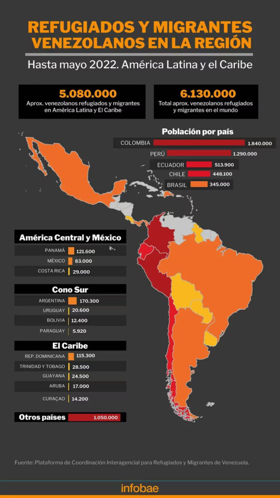 Y ponen el foco en los venezolanos que debieron dejar su país por la profunda crisis: “El mayor desplazamiento en la región ha sido de ciudadanos venezolanos que huyen de la violencia, la persecución política y la pobreza. En la actualidad existe un total 7,1 millones de venezolanos migrantes y refugiados en el mundo. De esta cifra, 5,96 millones (84,9 %) se encuentran distribuidos en 17 países de América Latina, especialmente en Colombia, Perú, Ecuador, Chile y Brasil”.