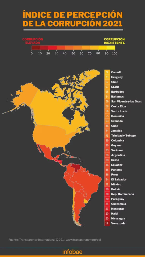 Respecto a la corrupción, se destaca que Uruguay, Chile y Costa Rica están cerca de la “corrupción inexistente”, mientras que Venezuela, Nicaragua y Haití aparecen con “corrupción elevada”.