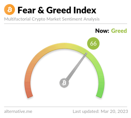 El índice de miedo y avaricia, una métrica que muestra el sentimiento general hacia bitcoin, actualmente apunta a 66, el nivel más alto desde noviembre de 2021.