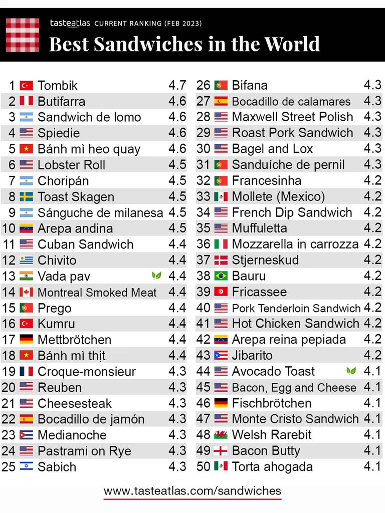 En la larga lista de Taste Atlas se incluyen también el sándwich de chivito, el plato nacional del Uruguay ; el vada pav de la India, una versión completamente vegetariana; el cubano, un sándwich prensado a la parrilla hecho con pan cubano que relleno con jamón, cerdo asado, queso suizo, pepinillos y mostaza. Originalmente fue inventado por inmigrantes cubanos en Florida; y el de carne ahumada de Montreal, Canadá.