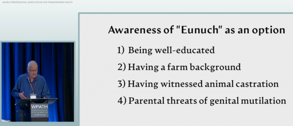 Tanto Johnson como Wassersug han presentado sus trabajos en conferencias organizadas por WPATH en el pasado. Más recientemente, Johnson habló en el 27º Simposio Científico celebrado en Montreal en septiembre sobre la existencia de una «identidad de género eunuco».