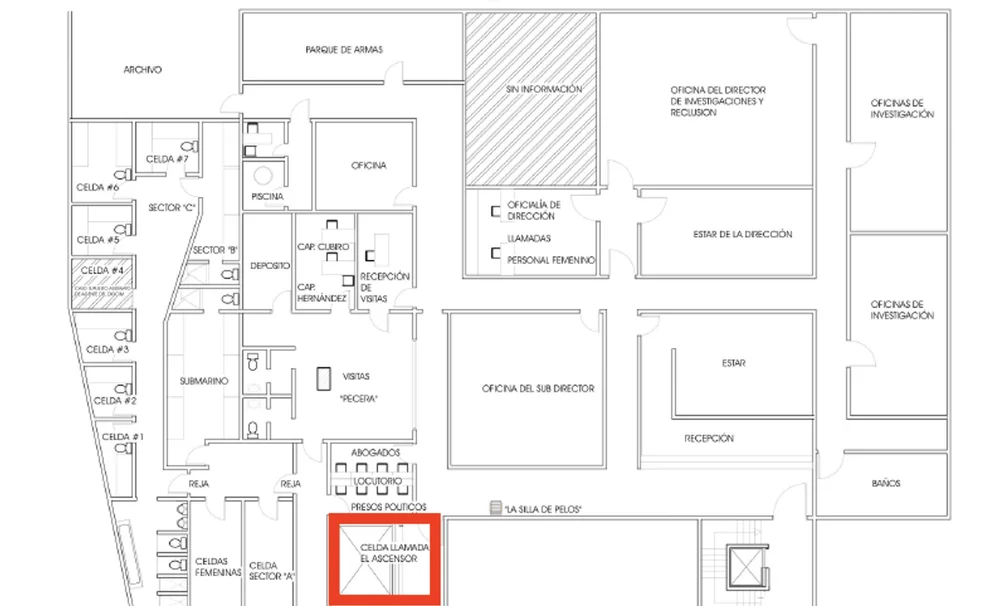 En esta imagen del plano que la Misión de Determinación de la ONU hizo sobre la DGCIM, se indica dónde está El Ascensor