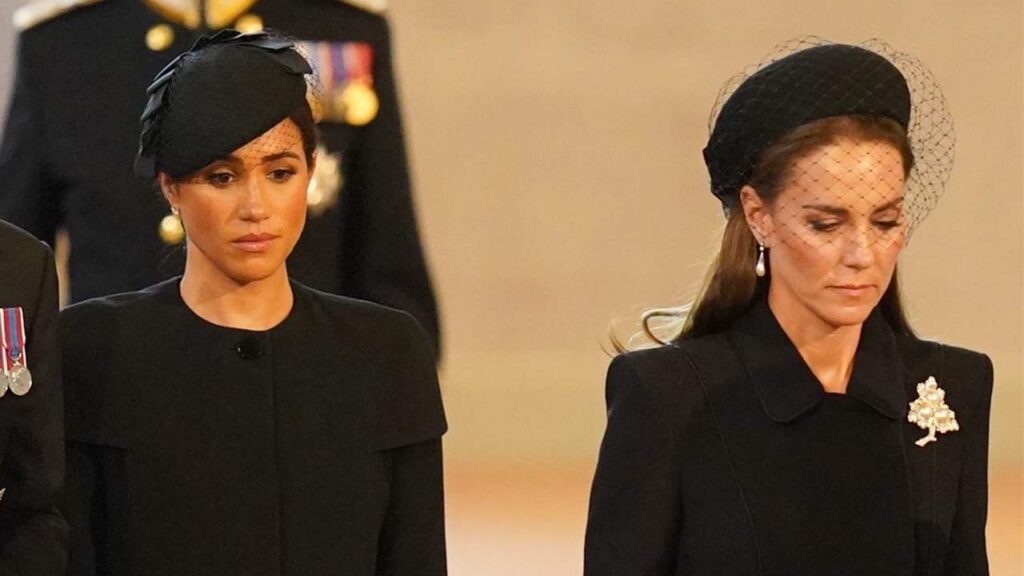 Al salir del funeral, Meghan caminó detrás de la reina consorte Camilla , el príncipe George, la princesa Charlotte, Kate Middleton y Sophie, la condesa de Wessex.
