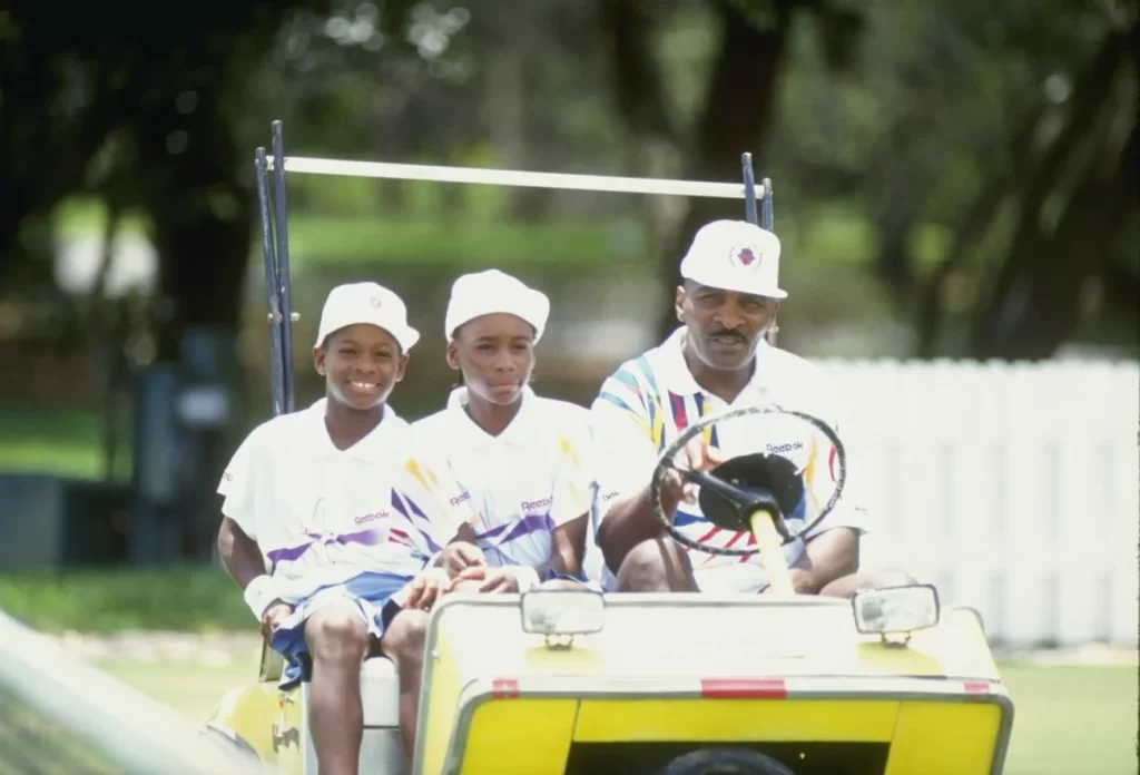 1992: Serena Williams y su hermana Venus Williams con su padre Richard Williams en un campamento de tenis en Florida.