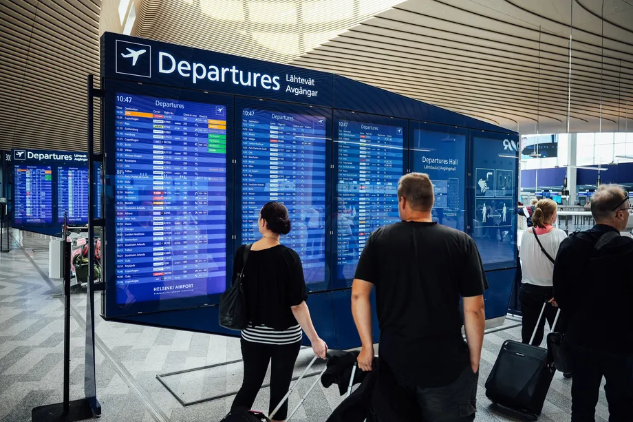 Los viajeros se paran frente a un tablero de salidas en el aeropuerto de Helsinki-Vantaa en Finlandia el 19 de agosto. Los autos deportivos de lujo están llenando el estacionamiento en el aeropuerto de Helsinki, ya que Finlandia se ha convertido en un importante país de tránsito para los turistas rusos que vuelan a Europa