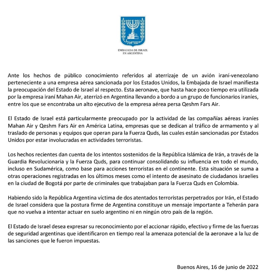La embajada expresó además el «reconocimiento» del Estado de Israel «por el accionar rápido, efectivo y firme de las fuerzas de seguridad argentinas que identificaron en tiempo real la amenaza potencial de la aeronave a la luz de las sanciones que le fueron impuestas».