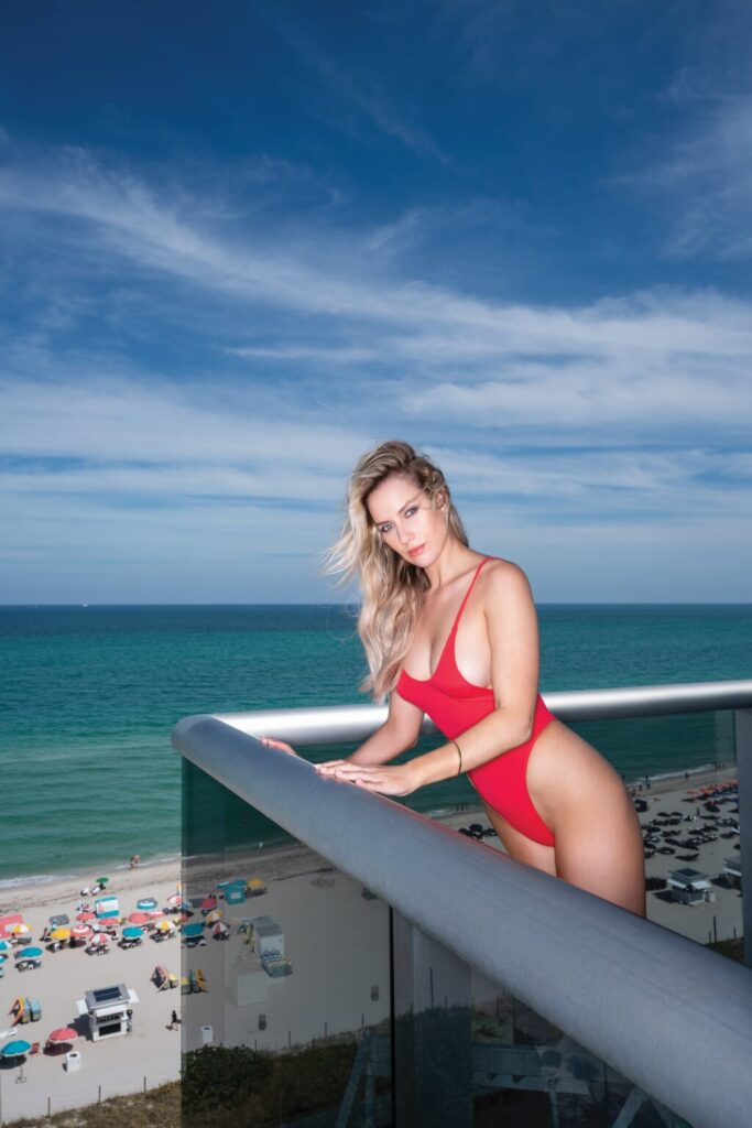 Spiranac posó sin sostén en una serie de fotos en la tirada de Maxim, incluyendo una variedad de looks sensuales. Una toma muestra a la rubia en la parte inferior de un bikini mientras está parada en un pedestal con vista a la playa.
