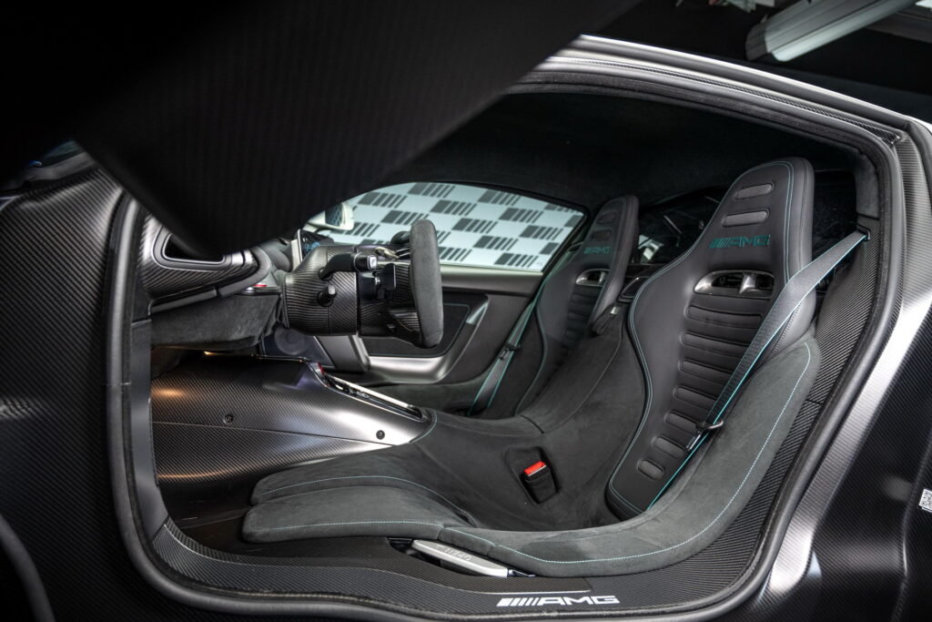 Los diseñadores de Mercedes eligieron un diseño de forma que sigue a la función para el interior, asegurándose de que todo esté donde debe estar. Los dos asientos estilo carrera se fusionan sobre el túnel central, pareciendo una extensión del monocasco de fibra de carbono, mientras que sus respaldos se pueden ajustar en dos posiciones. El volante estilo F1 con luces de cambio y botones integrados se ajusta eléctricamente y la caja de pedales y el reposapiés del pasajero se ajustan mecánicamente, para que pueda encontrar su posición de conducción óptima.