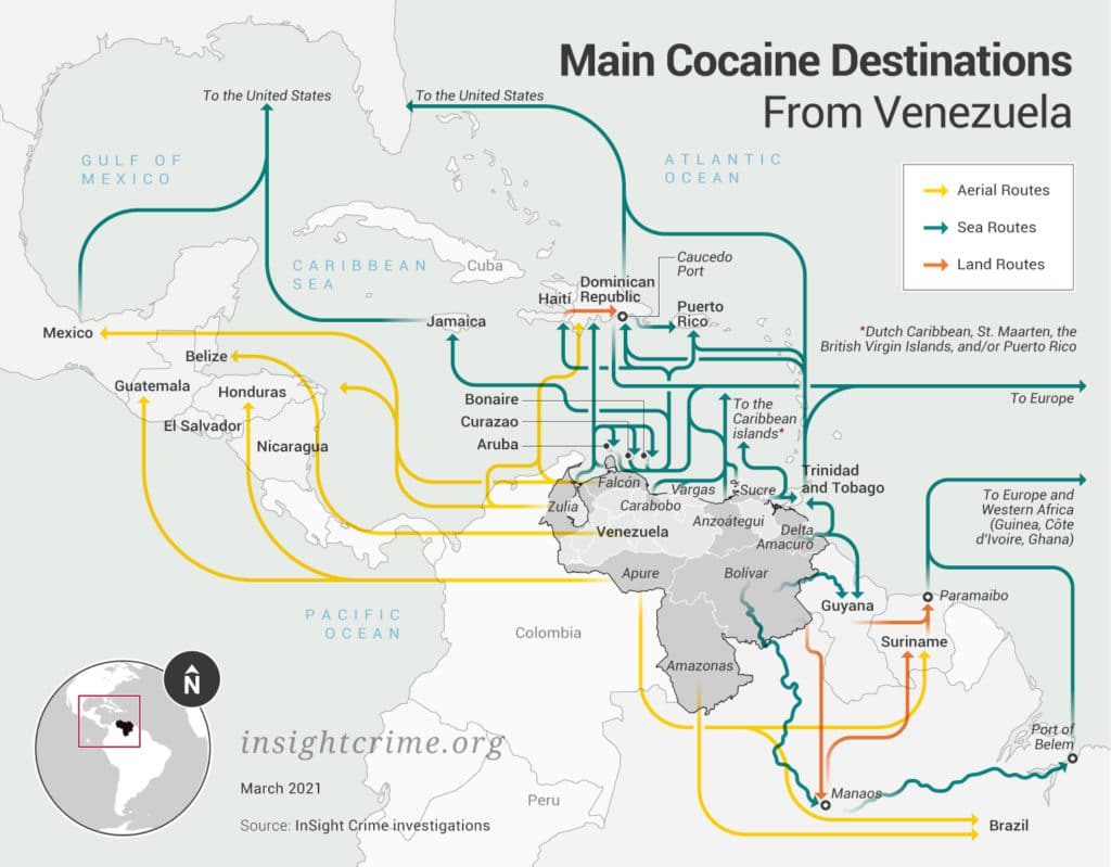 Luego, algunos envíos se despachan directamente desde la región fronteriza a bordo de avionetas, mientras que otros continúan tierra adentro hacia la costa del Caribe o hacia los puertos o aeropuertos de Venezuela. Desde allí, la cocaína viaja al norte a América Central o las islas del Caribe, o al sureste a Brasil, Guyana o Surinam. Eventualmente, terminará abasteciendo a los dos mayores mercados de cocaína del mundo, Estados Unidos y Europa.