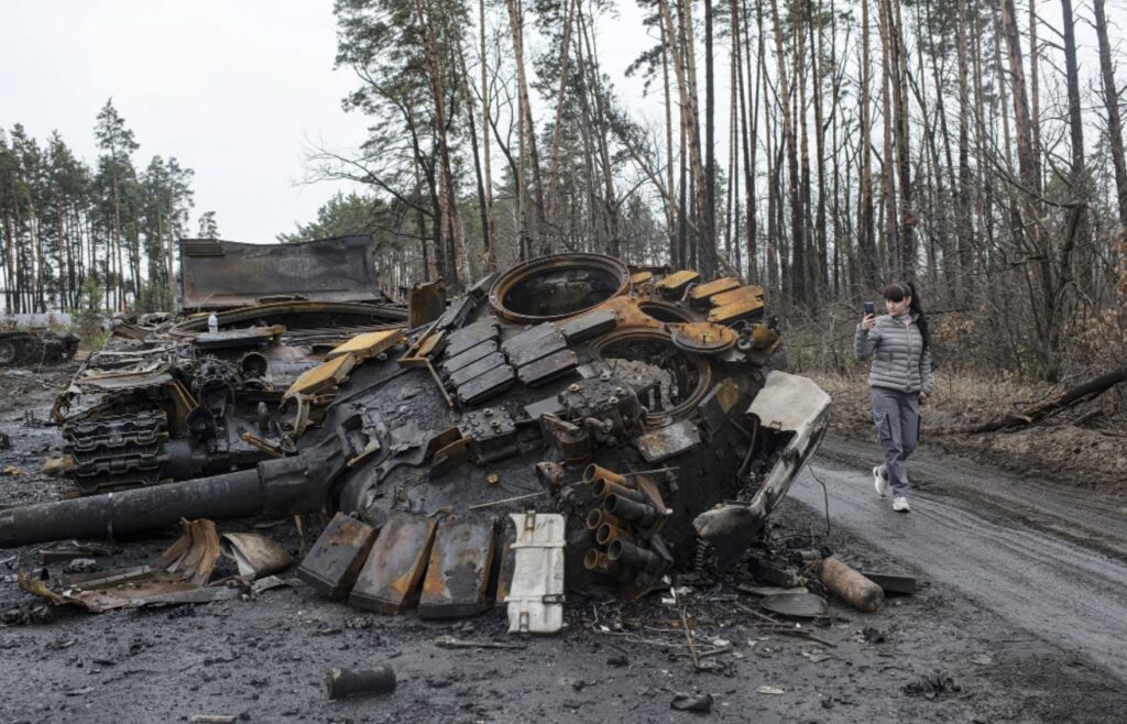 Una mujer pasa junto a un tanque ruso quemado, el 2 de abril de 2022 en Dmytrivka, región de Kiev, Ucrania. Después de 5 semanas de guerra, las fuerzas rusas alrededor de la capital han sido rechazadas en algunos lugares por los contraataques ucranianos. Pero los bombardeos persisten en los suburbios de Kiev que, como gran parte del país, sigue siendo vulnerable a los ataques aéreos rusos. | Imágenes de Alexey Furman/Getty