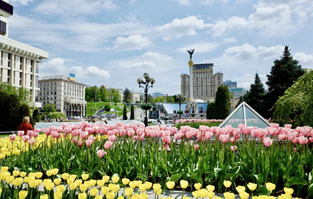 Los tulipanes reemplazaron las trampas para tanques en la Plaza de la Independencia central de Kiev, el 4 de mayo de 2022. | Christopher Miller/Político