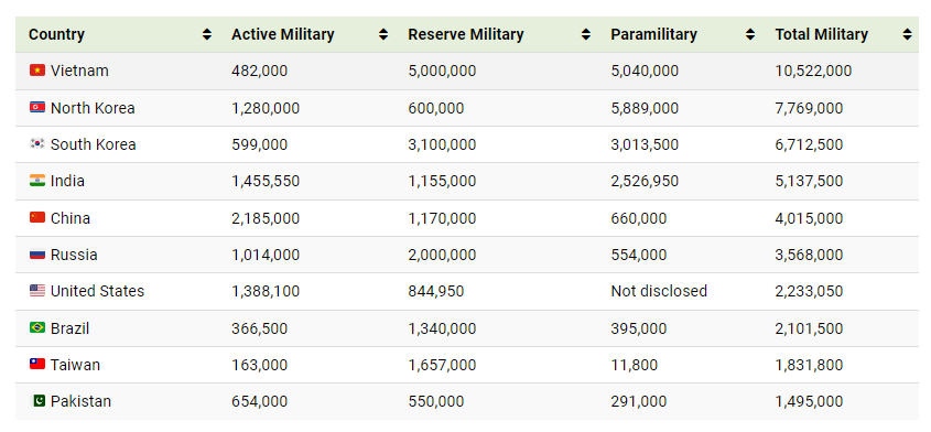 Al combinar los tres tipos de ejército, Vietnam se destaca con más de 10 millones de efectivos.