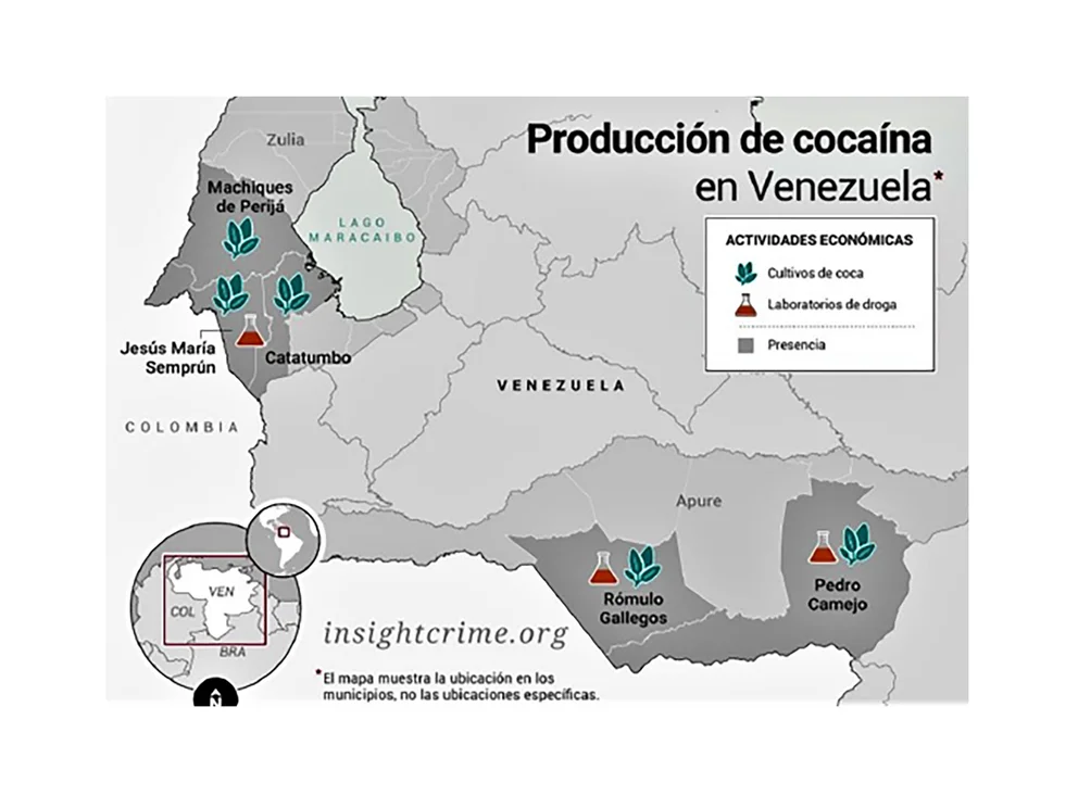 Los investigadores en Venezuela de InSight Crime revelaron evidencias de la presencia de cantidades significativas de coca en al menos tres municipios de Zulia, y dos más al sur, en el estado Apure. “Estas evidencias han sido verificadas y corroboradas por múltiples fuentes confiables”, resaltando que fuentes en las zonas, agencias internacionales e informes del gobierno venezolano “muestran que los laboratorios de cristalización utilizados para convertir la pasta de coca en clorhidrato de cocaína han estado proliferando en las mismas áreas”.