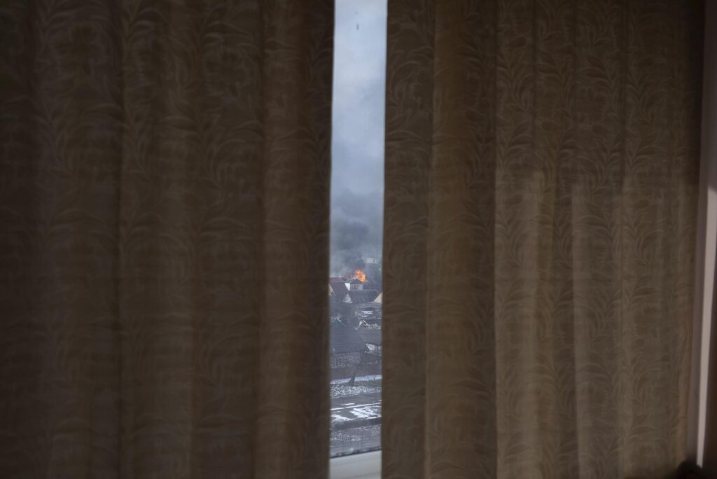 Vista a través de las cortinas parcialmente corridas, una casa en llamas después de un bombardeo en Mariúpol, Ucrania, el sábado 12 de marzo de 2022. (AP Photo/Mstyslav Chernov)