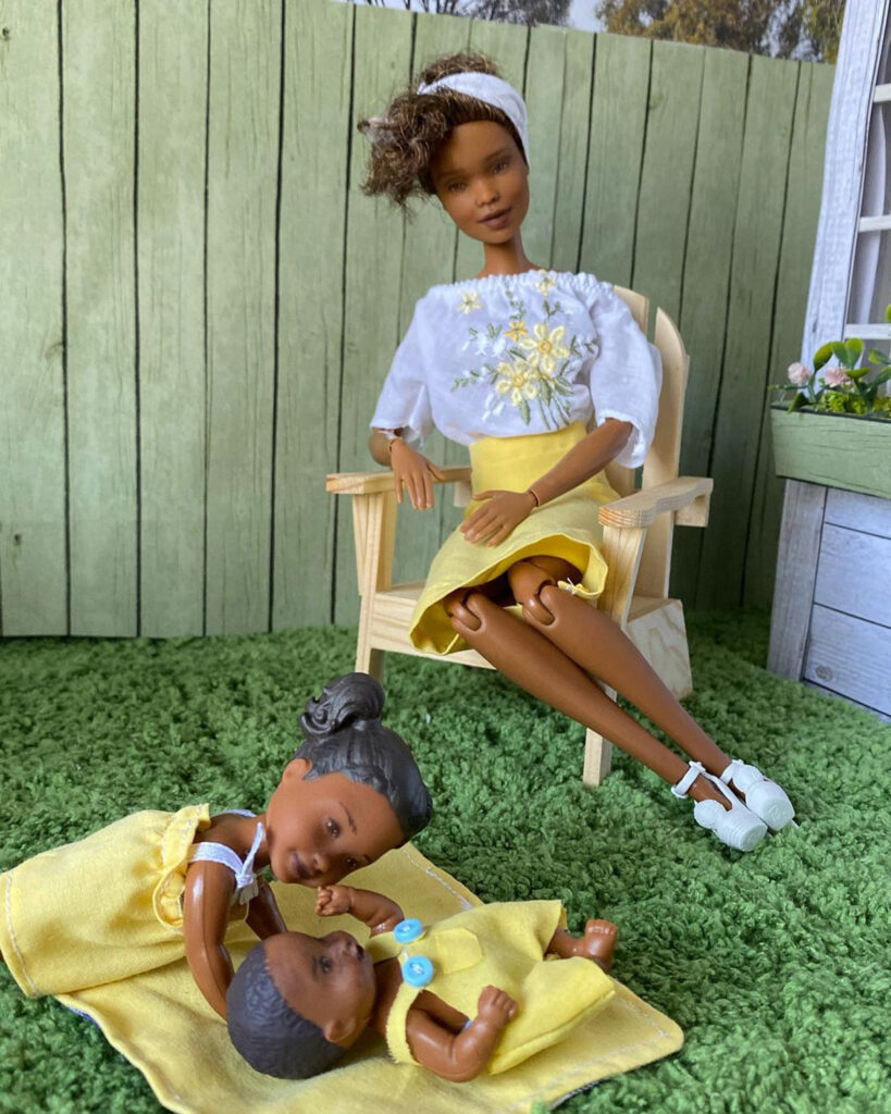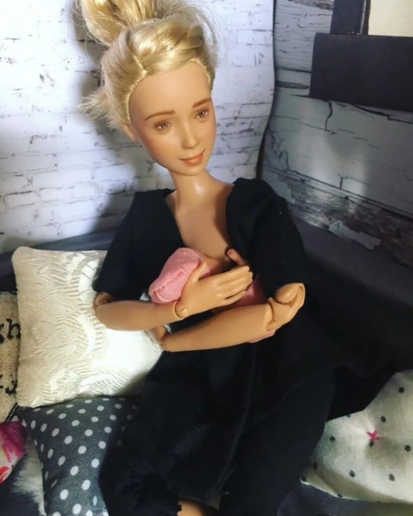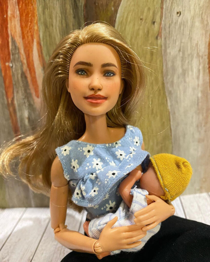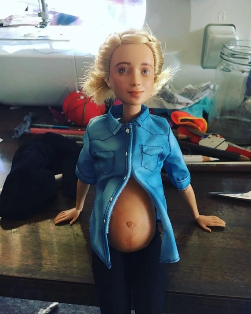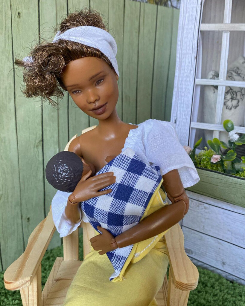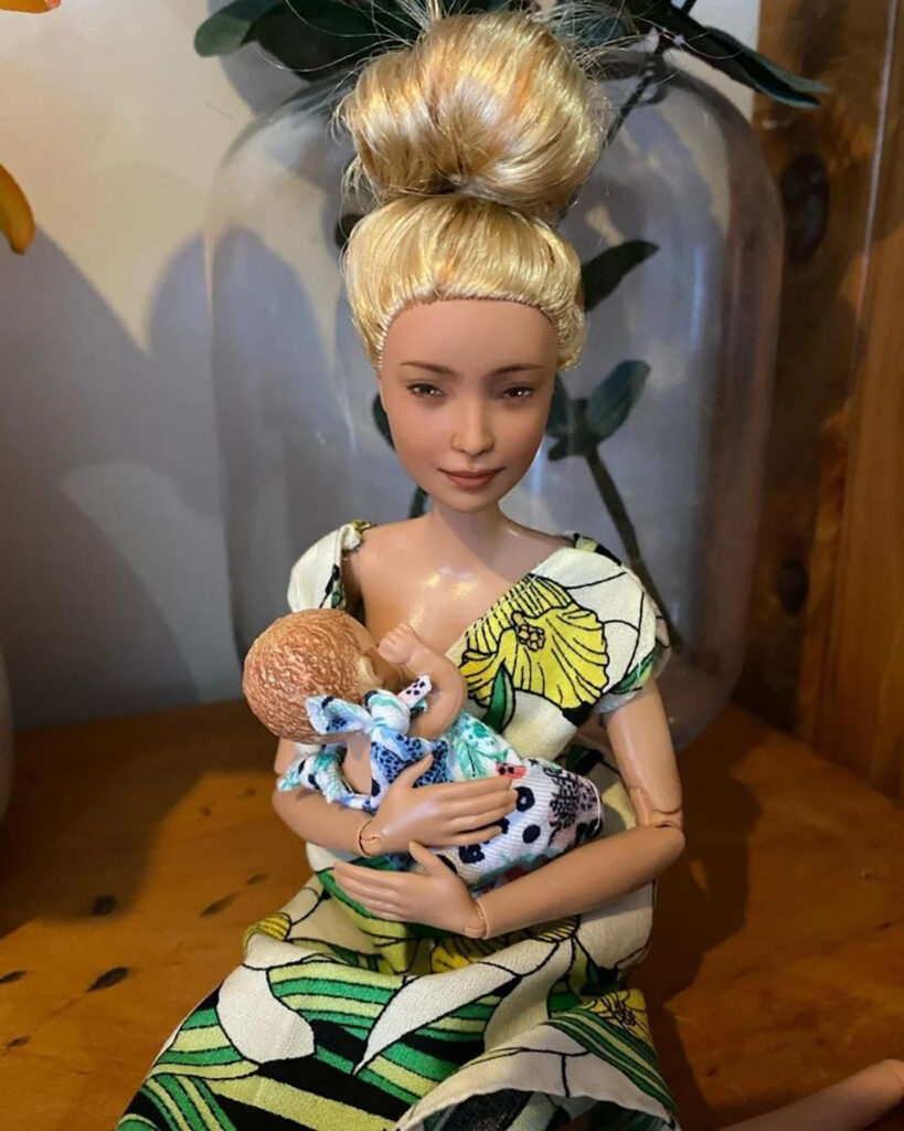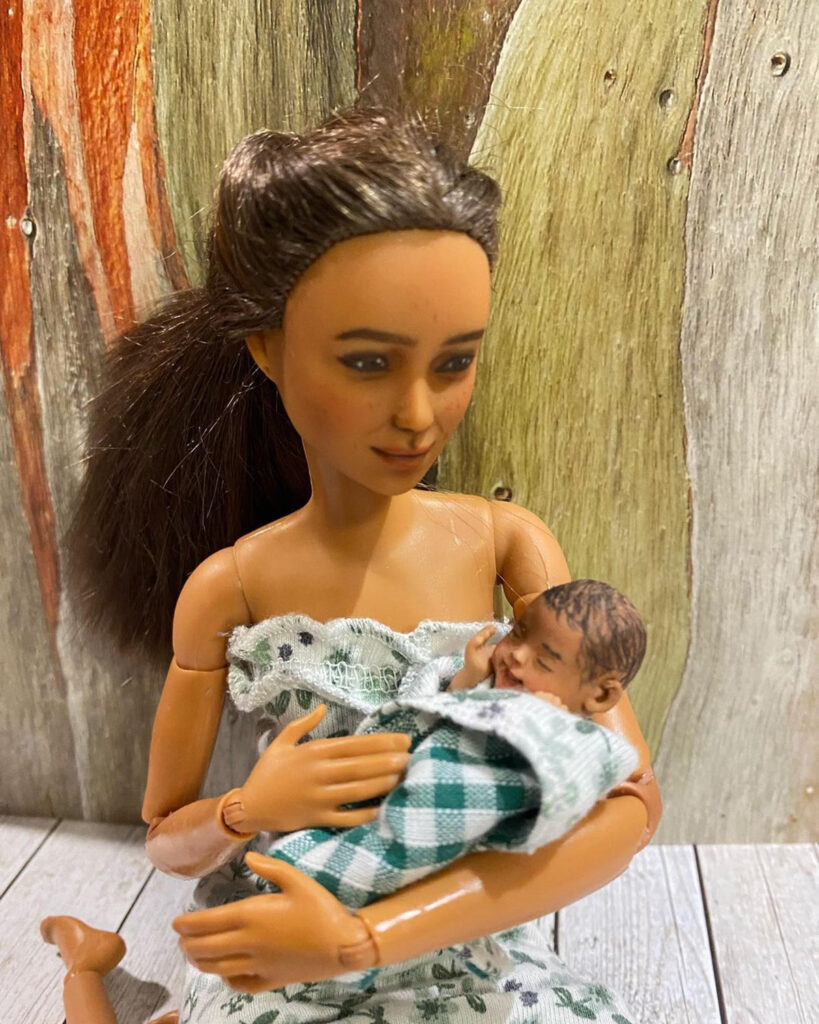 Betty transforma, recorta, repinta y viste las distintas muñecas de su taller. Pero una idea estaba particularmente cerca de su corazón en este proyecto: ilustrar la maternidad con modelos con vientres redondos o amamantando.
