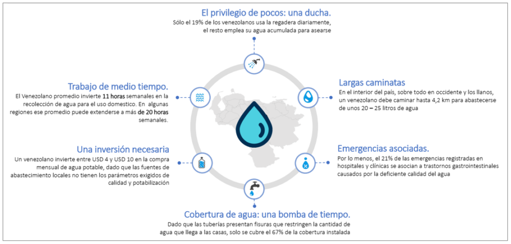 Durante 2021 en Venezuela los servicios básicos han presentado un gran deterioro. Más del 40% de las personas ha manifestado tener un suministro de agua potable bajo cronogramas de racionamiento irregular y casi el 40% ha manifestado una ausencia del suministro de agua por más de una semana. Por su parte, casi el 70% de los venezolanos manifestó tener un servicio de electricidad inestable día a día y 30% manifestó tener al menos una interrupción de este servicio por no menos de una hora diaria. Con relación al servicio de internet, el 85% de los venezolanos manifestó tener un servicio fluctuante y con fallas recurrentes durante el día, lo que imposibilita el normal desenvolvimiento de actividades en la web que demandan una conexión medianamente estable. Por último, el 91% de los venezolanos ha manifestado que deben realizar colas entre 2 y 12 horas de duración para poder surtir sus vehículos de combustible.
