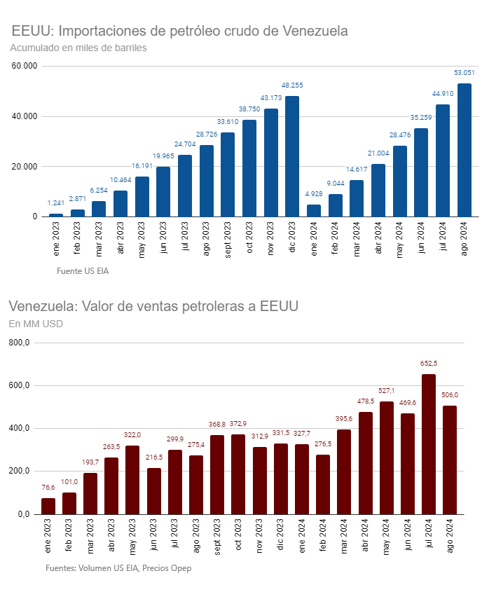 Desde que el gobierno de Joe Biden comenzó a flexibilizar las sanciones al régimen chavista otorgando a finales de noviembre de 2022 una licencia a Chevron para operar en Venezuela, los despachos a Estados Unidos se reanudaron desde enero de 2023, manteniendo una línea ascendente que ha sobrevivido a medidas como la no renovación desde abril de la Licencia General 44 al petróleo y el gas venezolano por el incumplimiento del Acuerdo de Barbados y la imposición de nuevas sanciones por el fraude cometido en las elecciones presidenciales del 28 de julio.