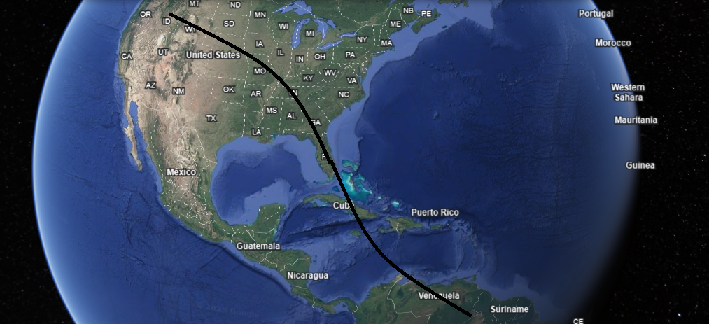 Desde el minuto 3:30 del video se aprecia la iluminación de la ciudad de Caracas, luego Maturín y finalmente Ciudad Guayana en su paso por Venezuela