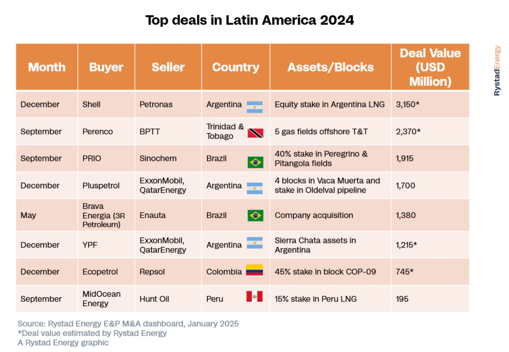 En la costa de Trinidad y Tobago, BPTT (una empresa conjunta 70:30 entre BP y Repsol) vendió su participación en cuatro activos de gas maduros y un campo no desarrollado a Perenco. El acuerdo más grande anunciado en Brasil el año pasado, en términos de valor de la operación, fue la adquisición por parte de PRIO de una participación del 40% en el campo Peregrino de Sinochem por 1.920 millones de dólares, reforzando su posición como el mayor operador independiente de Brasil. A esto le siguió la fusión planificada entre los actores brasileños 3R Petroleum y Enauta, por un valor empresarial de alrededor de 1.400 millones de dólares, con la entidad fusionada ahora rebautizada como Brava Energia.