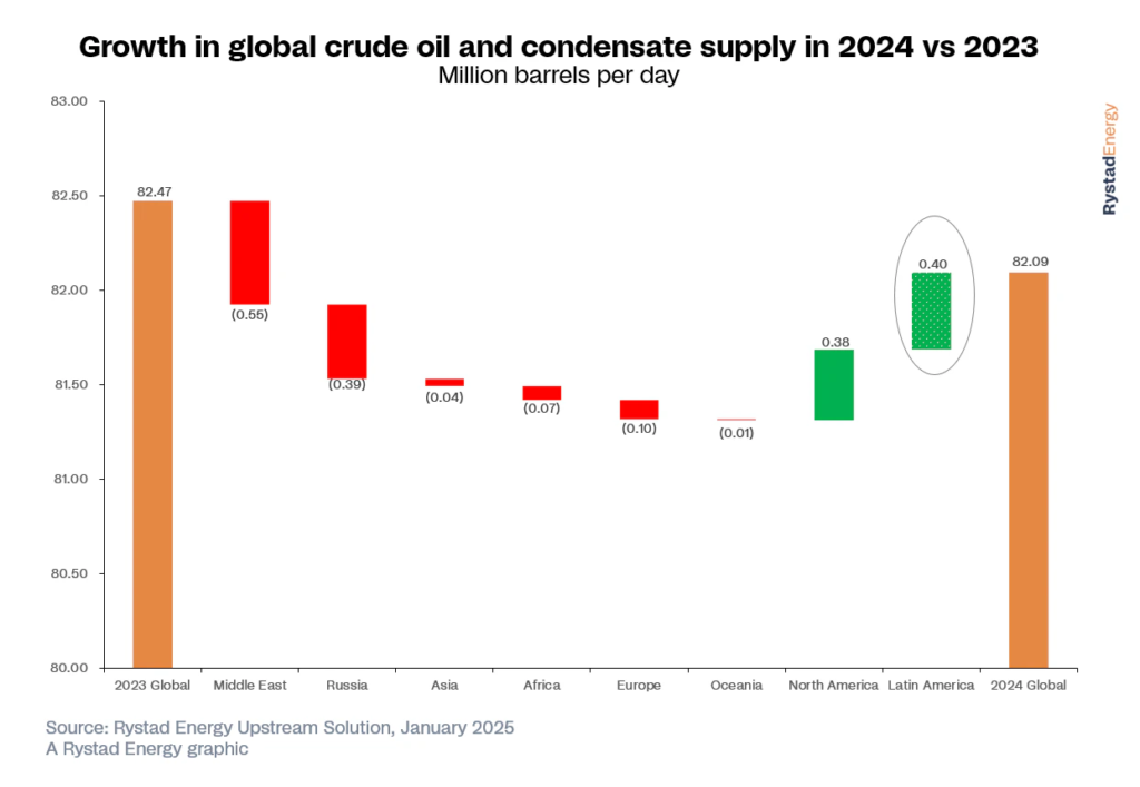 Rystad Energy estima que la producción de petróleo y condensado creció un 3,2% a 8,9 millones de bpd en 2024 en comparación con las cifras de 2023, respaldada por un aumento de los volúmenes en Guyana, Venezuela y Argentina. Este crecimiento fue relativamente moderado en comparación con el crecimiento estimado del 9% observado en 2023. La desaceleración se debe en gran medida a la baja producción en Brasil el año pasado debido a las actividades de mantenimiento, tanto planificadas como no planificadas, en algunos de los principales campos del país.